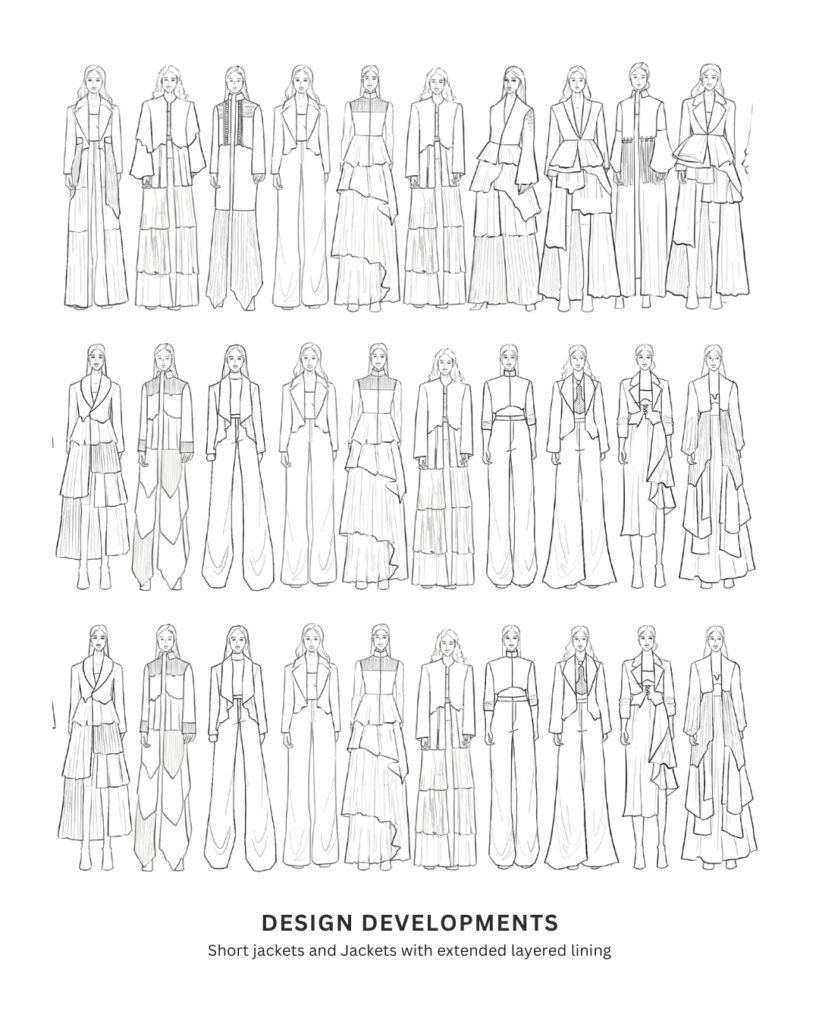 My approach to fashion design is rooted in storytelling, material exploration, and craftsmanship. From conceptual research and surface development to silhouette construction, I focus on transforming ideas into wearable expressions.