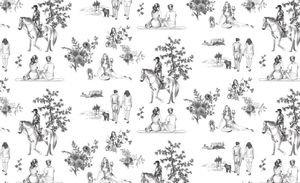 Toile de Jouy prints tell stories through their illustrations and motifs. I have created a print inspired by moments from everyday life. Little moments like my mom taking out pet dog for a walk, or a picnic with a friend. | 2022