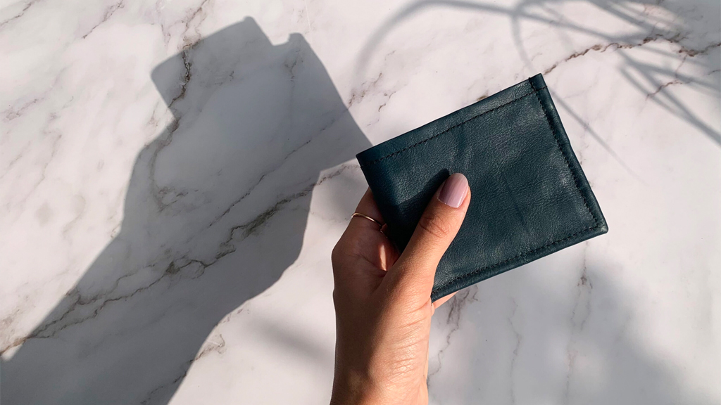 This hand stitched bifold wallet features three card slots on one side and a coin pocket on the other. It also has two bill compartments. Made using calfskin leather in the colour Teal. | 2020